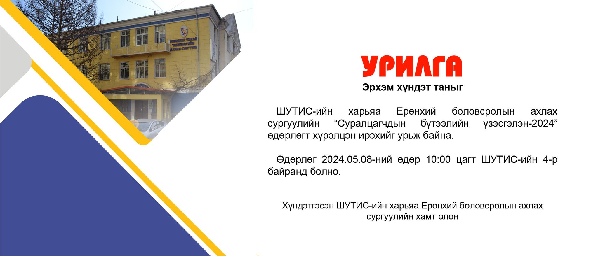 ШУТИС-ийн харьяа Ерөнхий боловсролын ахлах сургууль 2024-2025 оны хичээлийн жилийн төрөлжсөн хөтөлбөртэй X ангидаа элсэлт авна. Элсэн суралцах чиглэлүүд: -Инженерийн төрөлжсөн хөтөлбөртэй анги ...